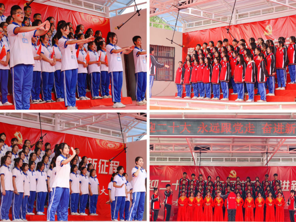 《地道戰(zhàn)》《毛委員和我們?cè)谝黄稹烦隽宋覀凕h往昔的崢嶸歲月?!兑黄鹣蛭磥?lái)》《美麗中國(guó)》《燈火里的中國(guó)》唱出了我們青少年在祖國(guó)母親呵護(hù)下茁壯成長(zhǎng)的幸福生活。《歌唱祖國(guó)》《沒有共產(chǎn)黨就沒有新中國(guó)》《國(guó)家》唱出了新時(shí)代青少年對(duì)敬愛的中國(guó)共產(chǎn)黨、偉大祖國(guó)的熱愛之情。一首首慷慨激昂的經(jīng)典旋律,宛若一篇篇壯美磅礴的篇章,滔滔不絕地講述著祖國(guó)的艱辛與堅(jiān)韌,贊美著祖國(guó)的遼闊與富饒,激蕩著同學(xué)們的愛國(guó)之情。